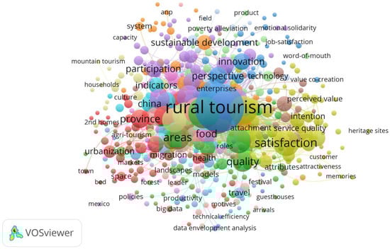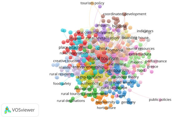- Cluster 1 (Red) focuses on the concepts of “sustainable tourism”, “rural development”, and “agritourism”, reflecting research centered on the role of rural tourism in sustainable development and the economic diversification of rural areas.