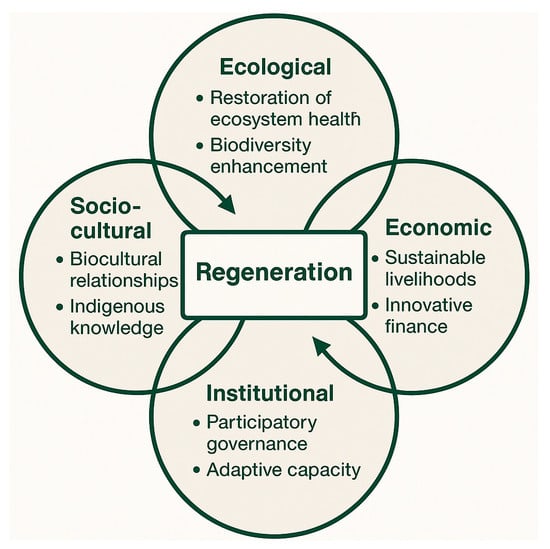 Regeneration, by contrast, seeks not only to preserve but also to revitalize and enhance ecosystems. It recognizes that degraded environments require more than maintenance—they demand active healing, renewal, and co-creation with nature [15]. Regenerative approaches aim to increase biodiversity, rebuild ecosystem functions, restore nutrient cycles, and empower communities as agents of ecological transformation [10,14].