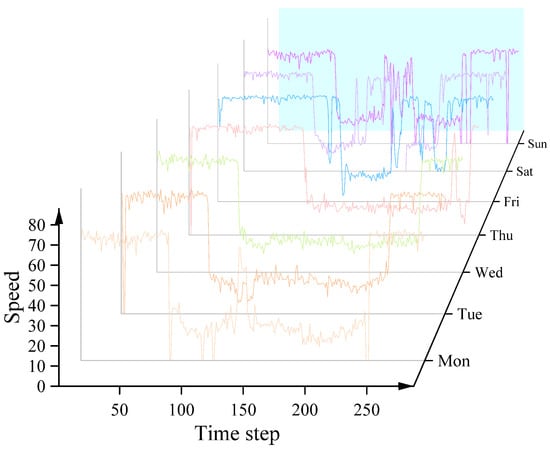 (2) Neglect of intra-node traffic pattern regularities. Existing studies primarily focus on spatial dependencies across different nodes [13,14,15] while paying insufficient attention to the repetitive structural information embedded in the temporal evolution of individual nodes. In practice, traffic nodes often exhibit strong periodic behaviors—for example, travel patterns on weekdays differ significantly from those on weekends. Effectively identifying and leveraging such structural flow patterns can enhance a model’s generalization ability and prediction accuracy under varying temporal conditions.