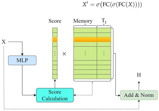 Here, denotes a fully connected layer, and represents an activation function (e.g., ReLU). The memory tensor is a fully learnable parameter used to store representative historical traffic patterns for each node. In this context, W denotes the number of memory slots per node, N is the number of nodes, and H is the dimensionality of each memory item. Notably, , allowing the memory to store a broader range of historical patterns than the current input sequence alone. During training, the memory is initialized using the Xavier initialization method and is continuously optimized via gradient updates as part of the network parameters.Each node is assigned an independent set of memory vectors (node-wise design), enabling the model to capture its unique long-term periodicity and evolutionary trends. The memory parameters are shared across all training batches to facilitate efficient representation learning and enhance generalization ability.