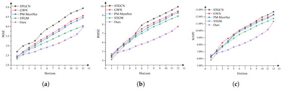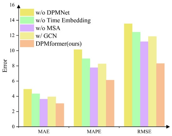 To provide a more comprehensive evaluation of the model’s performance across different prediction horizons, we conducted a step-wise prediction error comparison on the METR-LA dataset for 12 steps (i.e., 60 min), as shown in Figure 4. From the experimental results, it can be observed that in Step 1 (i.e., 5 min prediction), the error of DPMformer is relatively higher, which may be due to the more dramatic short-term traffic state fluctuations. Our model, which emphasizes modeling global trends, may have slightly limited ability to capture fine-grained fluctuations. However, as the prediction horizon increases, we find that the error growth rate of DPMformer is significantly lower than that of the comparison methods. Starting from Step 3, its performance gradually surpasses other models, and it maintains optimal performance across all subsequent prediction steps. This trend indicates that although DPMformer experiences slight losses in the early time steps, its overall prediction error exhibits stronger stability over time, enabling it to capture the medium- and long-term evolution of traffic flow more effectively.