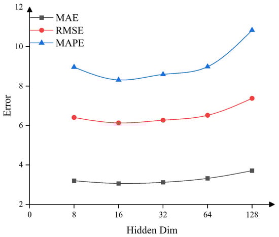 We tested the hidden dimension with values to evaluate its impact on model performance. The results, shown in Figure 6, indicate that the hidden dimension does not have a linear effect on model performance. The best performance is achieved when the hidden dimension is 16, and performance declines as the hidden dimension increases beyond that point.