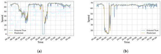 To more intuitively assess the model’s performance under different traffic patterns, we conducted a visual analysis by comparing the predicted results with the actual values, as shown in Figure 8. Due to space limitations, we selected the speed data from sensors 32 and 64 between 4:00 on 8 June 2012, and 4:00 on 9 June 2012, as representatives for display. The experimental results show that our model performs well in predicting future traffic states across different nodes and changing trends. Figure 8a shows the traffic speed data from sensor 32, which exhibits continuous fluctuations. Our model is able to track this trend well and accurately predict medium- to long-term traffic changes. This indicates that the model has strong capabilities in capturing node-level traffic evolution patterns, especially for nodes with clear periodic features and trends, where it exhibits good adaptability. Figure 8b displays the prediction results from sensor 64, where the speed curve exhibits significant fluctuations, including sharp increases and decreases. Although these changes are not caused by sudden events but rather reflect the complex evolution of the traffic system itself, the model maintains relatively stable prediction accuracy, demonstrating its generalization ability in modeling complex patterns. It should be noted that when there is significant noise interference in the data (such as sensor failures resulting in zero readings at certain times), the model’s fit may slightly degrade during those periods. However, this local error is normal and has limited impact on the overall trend modeling.