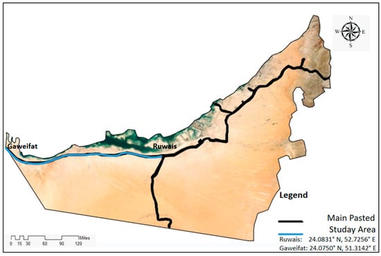 The majority of the railway is located in desert conditions; in this paper, the study area was between the Ruwais and Gaweifat Railway tracks, which run through the western region of the United Arab Emirates, with approximate coordinates for Ruwais at (24.0831° N, 52.7256° E) and Gaweifat at (24.0750° N, 51.3142° E). This section of the railway passes through desert terrain and plays a key role in connecting major industrial hubs in the region [2]. Therefore, wind erosion, and the consequent transport and deposition of sand are problematic and also tends to compromise the safety of railway facilities and their functionality. The accumulation of sand can block the rail tracks, lead to an upsurge in expenditures on repairs, and create dangerous situations on the train tracks. as shown in (Figure 1). This study covered geographical and environmental assessments in detail, considering the deposition of sand along the railway track. It also recommends the use of sand fence to mitigate the impacts of sand deposition. With the occasional formation of sand dunes, small and big, digital elevation models (DEMs) in the context of this paper were used to identify the terrain topography required to comprehend how wind influences sand accumulation on the terrain. High-built-up areas that contain steep gradients or high dunes result in the accumulation of sand on the railway track [8]. As shows in Figure 1, using the spatial software ArcGIS 10.7.1, topographic tests helped identify various portions of the track where the railway runs close to or right through sand dunes.