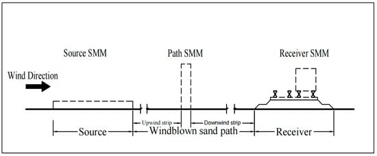 This study introduces a new classification of Sand Management Measures (SMMs) specifically for railways, aimed at addressing the previously identified limitations. This leads to the development of an innovative Source–Path–Receiver (SPR) scheme, as shown in Figure 2. Source SMMs are positioned directly over the source of the sand, such as dunes or loose sand sheets, regardless of the distance between the sand source and the infrastructure. Path SMMs are placed along the windblown sand path, extending from the source to the infrastructure, and their effectiveness depends on the overall geometry of the infrastructure. Receiver SMMs are located directly on the infrastructure itself, and their effectiveness is highly dependent on the type of infrastructure [10].