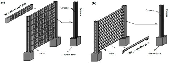 Diagram shows the proposed design of the sand fence: (a) non-ventilated sand fence, and (b) ventilated sand fence.
