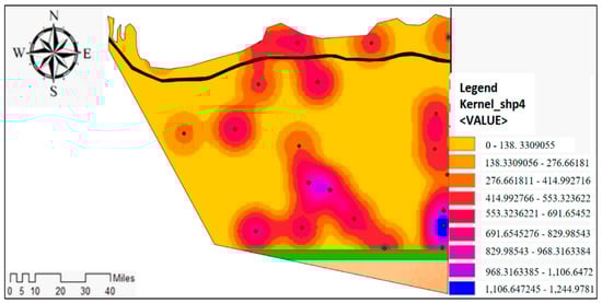 Maps were generated to visualize changes in sand accumulation risk before and after the implementation of sand fences. The visual representations included heat maps, with high-risk areas before the installation of sand fences highlighting warm colors in Figure 5, indicating where significant sand deposition was expected. Following the installation, cooler colors represented reduced risks and lower flow accumulation values.