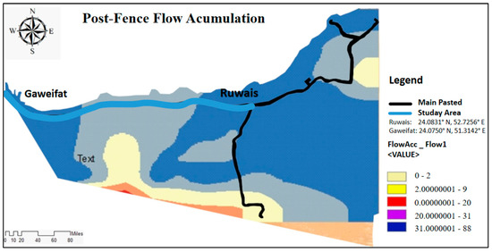 Sand fence integration was used after modeling the pre-fence conditions, a vector layer representing the sand fences was introduced into the GIS environment. The same flow accumulation tool was applied post-fence installation, allowing for a comparative analysis of sand deposition risk. The sand fences were expected to disrupt wind flow, reducing the velocity of wind and its capacity to transport sand. The results of the flow accumulation analysis after sand fence installation showed the following change. The data in Table 3 illustrate a significant reduction in flow accumulation, particularly in high-risk areas. Abu Dhabi scored 800 cells, while Liwa Ossis has 1200 cells.