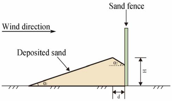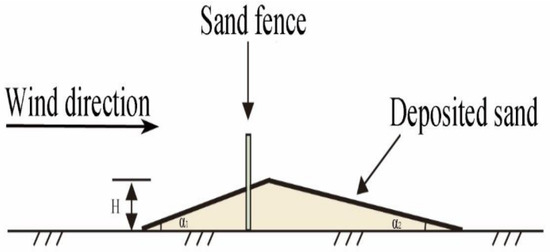 When the sand fence is a non-ventilated sand fence (a sand fence without pores), the sand material cannot go through the fence and can only be deposited on the outside of the fence. The deposited sand body morphology is related to deposited sand amount, the wind condition, etc. According to the actual measurement of (Lanzhou-Xinjiang high speed railway in Xinjiang Yandun section, China) [18], the deposited sand body profile is a partial of approximate triangle, as shown in Figure 11. Its windward slope is gentle and 12–18°. The top of the slope has a reverse slope formed by reflective wind, and the reverse slope is steep, and can get to the natural angle of repose of the sand material. The ridge line formed by a deposited sand body is generally 1.0 m away windward side of the sand fence.