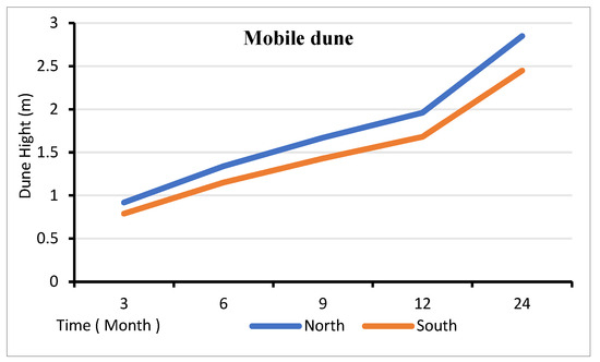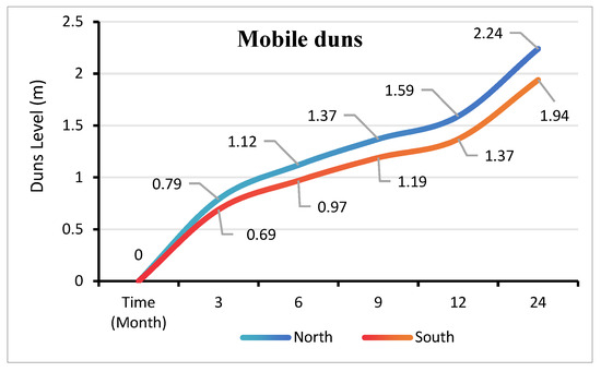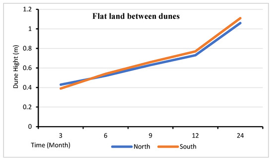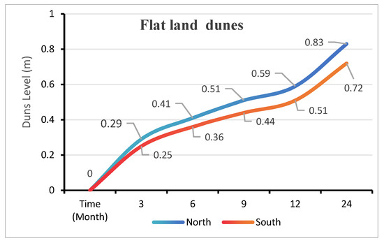 For the flat land between dunes, sand deposition is lower compared to the mobile dunes. On the north side, deposition starts at 0.43 m at 3 months, rising to 0.52 m at 6 months, 0.63 m at 9 months, 0.73 m at 12 months, and 1.06 m at 24 months. On the south side, deposition begins at 0.39 m at 3 months, increasing to 0.54 m at 6 months, 0.66 m at 9 months, 0.77 m at 12 months, and 1.11 m at 24 months, as shown in Figure 13.