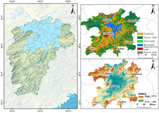 The PLEEZ is located in the northern part of Jiangxi Province (114°29′~117°42′ E, 27°30′~30°06′ N), encompassing cities including Nanchang Jingdezhen, Yingtan, and Jiujiang, with a total of 38 counties (cities/districts) and an area of 51,200 km2 (Figure 1). Poyang Lake, recognized as China’s largest freshwater lake and an internationally significant wintering habitat for migratory birds as well as a designated wetland reserve [56,57], plays a critical role in safeguarding water security for the middle–lower Yangtze River basin. Its ecological effects profoundly influence the sustainable development of both the Yangtze River Economic Belt and broader East Asian regions [14]. However, this region has recently experienced significant ecological degradation, manifesting as water area contraction, heavy metal contamination, water quality deterioration, and biodiversity loss [13,58,59,60] that necessitate scientifically sound ecological measures to identify landscape risks and sustain its essential ecological functions.