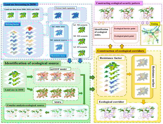 This study used land use data from 2000, 2010, and 2020 to simulate and predict land use conditions in the PLEEZ for 2030, considering three scenarios: ND, ED, and EP. Next, the importance of habitat quality in this study area for 2030 was analyzed. The results were combined with core areas identified by the MSPA model to delineate ecological sources, which were classified based on their importance using the Conefor 2.6 model. Subsequently, a comprehensive resistance surface was constructed for the study area, considering factors such as land use types, DEM, slope, and proximity to roads. Finally, using circuit theory, the Linkage Mapper software extracted corridors, nodes, and barriers to establish the ecological security pattern. The technical framework is illustrated in Figure 2.