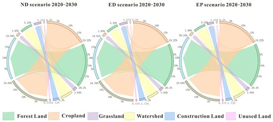 The PLEEZ shows large differences in the area of each category under the three different scenarios compared to 2020. As shown in Table 5, under the ND scenario for 2030, cultivated land, forested areas, and unused land decreased by 389.05 km2, 265.95 km2, and 13.07 km2, respectively. In contrast, built-up land, grassland, and water bodies expanded by 627.3 km2, 25.32 km2, and 15.45 km2, respectively. In recent years, economic development has led to a significant increase in built-up area, which has risen by 1.23% compared to the 2020 level. This increase is primarily due to the conversion of cultivated and forested lands. As illustrated in Figure 3, during natural evolution, the expansion of cultivated land is mainly driven by the conversion of forested and built-up areas, while a small portion of cultivated and unused land is being transformed into watersheds.