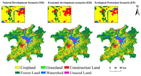 Under the ED scenario, the areas of cultivated land, forested area, and water bodies experience significant reductions of 475.23 km2, 301.38 km2, and 184.45 km2, respectively, compared to 2020. Supported by relevant economic policies, the area of construction land increases markedly by 968.63 km2, or 1.89%, primarily through conversion of cultivated land, forested land, water bodies, and unused land.