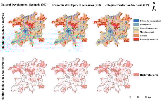 To evaluate the quality of habitats in the PLEEZ, the natural breakpoint method was employed to classify habitats into six levels of importance: extremely unimportant, unimportant, generally important, relatively important, important, and extremely important. The areas classified as “important “and “extremely important” were identified as potential ecological source sites. Alternative source areas are primarily located in the northeast and northwest, southeast of Guixi City, and in the Poyang Lake region. High-value habitat areas are dispersed across Nanchang, Jinxian County, Shangrao, Yugan County, and Leping City. For 2030, the total important and very important patches under different scenarios was projected at 13,992.30 km2, 13,743.60 km2, and 14,715.56 km2, respectively. The distribution of high-value habitat quality areas remains relatively stable across the three scenarios, with minimal changes (Figure 5). The overall pattern follows a trend toward “higher to the north and lower to the south, denser to the north, and sparser to the south”. Under the ED scenario, the area of high-value zones decreases, whereas under the EP scenario, patch density increases in the northwest and northeast regions.