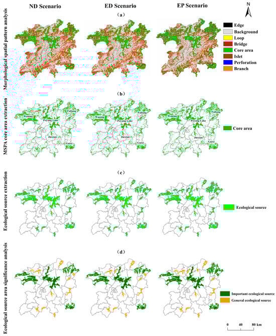 Using the MSPA analysis, woodlands, grasslands, and watersheds were designated as foreground analysis data, while other land categories were considered background analysis data. As shown in Figure 6a, the core areas under three scenarios for 2030—the ND Scenario, ED Scenario, and EP Scenario—are 9157.33 km2, 9030.97 km2, and 9643.83 km2, accounting for approximately 17.89%, 17.64%, and 18.84% of total study area (Figure 6b). Ecological protection scenario demonstrates a notable increase in core area, whereas this economic development scenario shows a reduction owing to the conversion to economic land of portions of forest and grassland. Spatially, the core areas are primarily concentrated in Jinxian County in the center, the Poyang Lake region, Wuning County in the northwest, Pengze County to the north, and Fuliang County in the northeast.