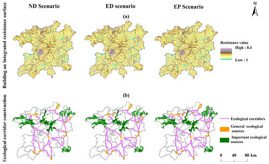 MCR modeling was employed to generate a composite resistance surface, categorizing resistance values into five levels (1, 3, 5, 7, and 9), with smaller values indicating less resistance to species migration and spatial movement. In this study area, the resistance values varied between 1 and 8.4. The average resistance under the ND, ED, and EP scenarios had smaller differences of 3.19, 3.21, and 3.17, respectively. This suggests that economic development can influence the landscape connectivity of ecological spaces to some extent, thereby impacting the flow of organisms at the spatial scale. As shown in Figure 7a from the regional distribution, the Qingshanhu and Honggutan districts in Nanchang City, Zhujiang district in Jingdezhen City, Yushui district in Xinyu City, and Yuehu district in Yingtan City are the clusters of areas with high resistance values. The resistance values in Fuliang and Wuning counties, which have better natural ecological and environmental protection, are significantly lower. In general, with the exception of a few urban agglomerations, the high and medium value zones are scattered, while the low-value resistance zones are contiguous and show a block distribution pattern.