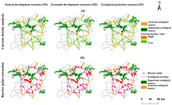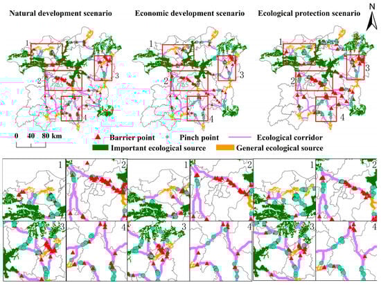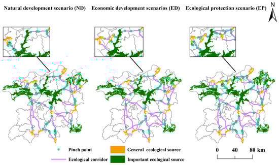 Based on the current density analysis, the number of ecological pinch points were extracted as 94, 62, and 107 under three different scenarios (ND, ED, and EP), respectively. In terms of the spatial distribution patterns, pinch points were primarily located at intersections of corridors with source areas and predominantly concentrated in cropland, woodland, and grassland land types. Comparisons revealed significant variations in number of pinch points along specific ecological corridors, including the corridor connecting the southern Ruichang City source area to the Poyang Lake source area, the western Pengze County source area to the Poyang Lake source area, and the corridor connecting southern Linchuan to southern Fengcheng (Figure 8). Notably, the number of pinch points under the EP scenario increased significantly. Ecological pinch points, characterized by rich biodiversity and fragile ecosystems, showed a decrease under the ED scenario due to growth of the economy and the interference of human activities on natural ecosystems.