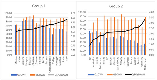 Housing ownership rate by first and last 20% income wuantile (Q5/Q1OWN). (Group 1: countries with below-median GDP per capita; Group 2: countries with above-median GDP per capita; Q1OWN: the homeownership rate of the bottom 20% income quantile; Q5OWN: the homeownership rate of the last 20% income quantile).