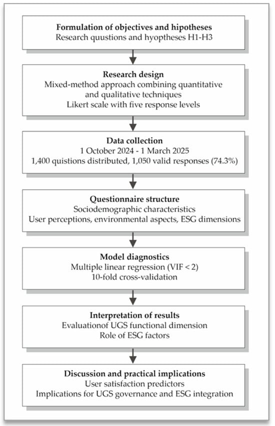 To ensure methodological comprehensiveness, a mixed-methods design was employed, combining structured quantitative data with qualitative insights derived from open-ended responses and contextual comments. The integration of both data types was achieved through triangulation, where qualitative observations were used to interpret statistical results, particularly in instances where unexpected or counterintuitive relationships were revealed through regression modelling. This approach enabled a more nuanced understanding of user experiences with urban green spaces and strengthened conclusion validity. To illustrate the research design and sequential analytical phases, Figure 1 presents a flowchart outlining key steps, including hypothesis formulation, data collection, questionnaire structure, model diagnostics, and interpretation of results. This structure highlights how the triangulation of methods contributed to a more robust interpretation of the data and enhanced the explanatory depth of the research findings.