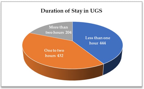 Reported duration of stay in UGS (Figure 9) shows that the majority of users spend relatively short periods in green spaces. Most respondents stay less than one hour (41.1%) or between one and two hours (39.3%), while only 18.9% remain for more than two hours. These findings suggest that visits to UGS in Novi Sad are typically brief and likely focused on specific activities such as short walks, rest during daily routines, or time-limited leisure. The low proportion of extended stays may reflect limited availability of facilities that support longer visits (e.g., cafés, shaded resting areas, or organised activities), or a preference for UGS as transitional rather than destination spaces. Future improvements could consider how to enhance comfort and diversify offerings to encourage longer and more varied use of these urban areas.