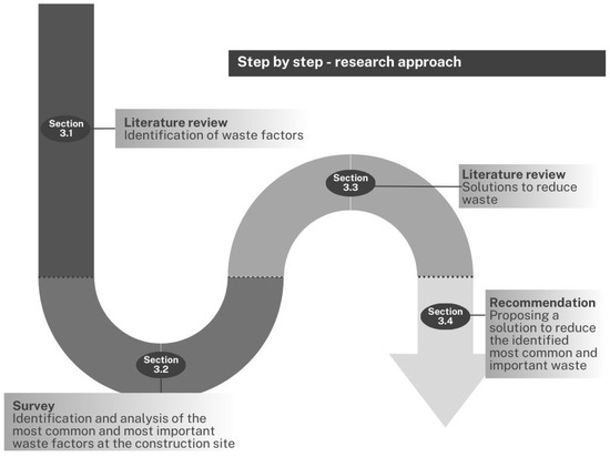 Subsequently, waste reduction strategies recommended in the literature were reviewed, particularly in relation to the most significant and frequently occurring types of waste, as assessed by respondents. The study concluded with recommendations aimed at optimising construction process efficiency by reducing critical waste factors. The steps involved in the research approach are illustrated in Figure 1.