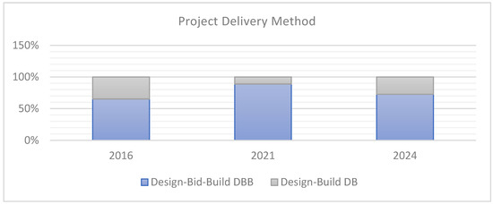 Figure 2 presents the project delivery methods for the construction investments surveyed, with a clear majority (2016: 65%, 2021: 89% and 2024: 73%) opting for the Design–Bid–Build DBB approach, which is the most commonly used in Poland.
