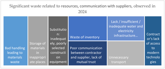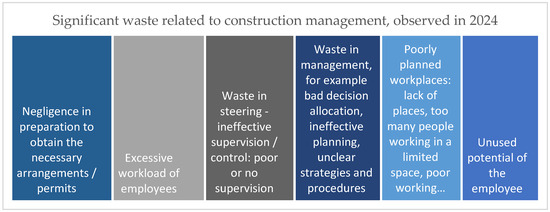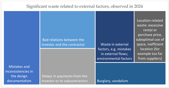 Other identified sources of waste included imprecisely defined investor requirements, underscoring the importance of clear specification to avoid dissatisfaction with project outcomes [40]. Noteworthy waste factors also included inaccurately assessed time frames for project completion, dictated by investors, which could introduce further wastes related to hasty execution and insufficient planning, as well as equipment failures during commissioning, potentially damaging work completed to date and extending project deadlines.