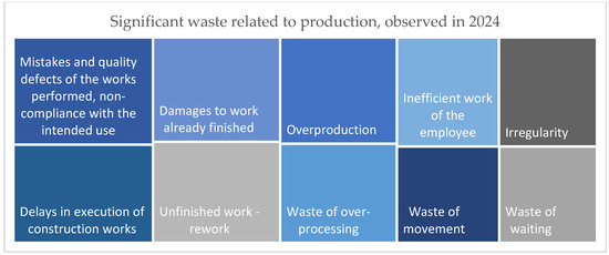 In the construction sector, Ohno’s seven wastes are not as significant and frequent, except for the production of defective products. Their importance was rated highly, especially in 2024, being considered significant and taking second place.