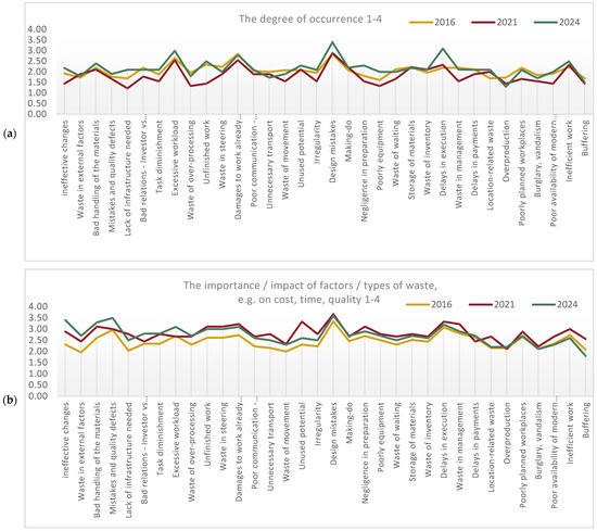 These visual representations regarding the frequency of waste consist of a marked decrease in overproduction waste, suggesting a shift towards more efficient production practices. However, an increase in incidences is particularly visible for design mistakes, delays in execution, and negligence in preparation. Conversely, the graph pertaining to importance showcases a diverse range of responses, with a general trend indicating an increase. In particular, the chart reveals a significant rise in the importance of inefficient change implementation. The lack of effective control over the work performed and delayed responses to improperly executed tasks lead to increased costs for their rectification. The increase in value is also visible in waste due to external factors and poor handling of materials, which also leads to waste.