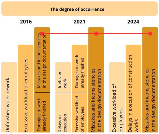 For enhanced clarity, Table 6 summarises the most significant and frequent waste factors at the construction site, based on surveys from 2016, 2021, and 2024. Mistakes and inconsistencies in the design documentation, delays in execution of construction works, mistakes and quality defects of the works performed, and non-compliance with the intended use emerged as the predominant waste factors, alongside design mistakes, damages to work already finished, excessive workload of employees as the most commonly encountered issues. Design mistakes, as the most significant and frequent waste factor, may result from the slow adoption of modern technologies that facilitate cross-disciplinary coordination and the early detection of design errors. This is particularly concerning, given that the construction sector remains the least digitised among all economic sectors [41].