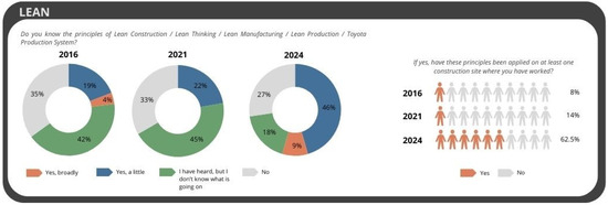 Lean Construction focuses on eliminating non-value-adding activities and improving workflow reliability. Studies demonstrate its capacity to reduce waste factors such as waiting, overprocessing, and overproduction. Tools like Value Stream Mapping and checklists, combined with stakeholder collaboration and training, are identified as supportive mechanisms. Survey findings reflect a growing familiarity with, and use of, Lean Principles among practitioners, with implementation increasing from 8% in 2016 to 63% in 2024.