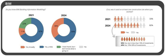 Survey research made it evident that all respondents, to varying extents, had heard of Building Information Modelling. In 2021, 22% of respondents were aware of BIM but lacked a comprehensive understanding of its implications. By 2024, this lack of understanding had completely dissipated, with an increased proportion of respondents (36%) demonstrating a deeper familiarity with BIM. The percentage of respondents utilising BIM on least one project escalated from 33% in 2021 to 82% (56% of them were used in less than 10% of investments and 44% in 10–50% of investments) in 2024, indicating a growing awareness of BIM among construction contractors. Caution is advised when interpreting these findings, given the significant disparities in BIM implementation maturity. If a project is fully conducted within the BIM methodology, the scale of benefits derived from BIM adoption is undoubtedly greater. Respondents who indicated the use of BIM in their projects might have only applied a single tool. This presents a promising direction for verification in the future.