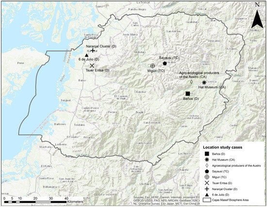 This study examined eight significant cases within an Ecuadorian–Belgian academic project in the Cajas Massif Biosphere Area, in southern Ecuador (Figure 1) [86]. In the Andean region, this study incorporates peri-urban cases such as Baños; rural cases like Sayausí and Migüir; and urban–rural interaction cases, including the Austro Agroecological Producers and the Hat Museum in Cuenca. In the coastal zone near Guayaquil, rural cases from the Naranjal Cluster, Tsuer Entsa, and 6 de Julio were examined. The selection of these case studies was carried out through a participatory process lasting approximately two months. This involved approaching communities, presenting the project objectives, and assigning shared responsibilities. The inclusion criteria were defined based on both operational feasibility and the willingness of local actors to collaborate. Specifically, the selected territories met the following requirements: (1) being located within the area of influence of the Cajas Massif Biosphere Area (CMBA); (2) having initiated tourism-related activities; (3) expressing interest in being part of the project; (4) allowing students to conduct fieldwork; and (5) formally agreeing to sign a cooperation agreement. It is worth noting that the final three criteria were the most difficult to meet, as they required a level of commitment, institutional openness, and coordination among actors not always present in the initially considered locations [87]. This selection aimed to ensure suitable conditions for participatory engagement and the rigorous systematisation of information in real-world contexts.