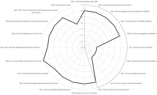 The right-hand side of the chart shows a positive attitude towards tourism, except for question 31, which reflects a sense of realism. The left-hand side of the chart contains statements sensitive to the “pandemic”, as tourism, although underdeveloped, came to a halt and impacted many people. In this case, 45% of the respondents claimed to engage in local tourism (Q1); thus, opinions about tourism were generally positive. However, a sense of realism emerges, particularly encapsulated by the statement “The COVID-19 pandemic has shown that we cannot depend on tourism as a source of income in my community” (Q9). This contradicts the equally significant statement “In the future, tourism will be the main activity in my community” (Q17). This reveals that, despite the weaknesses of tourism, residents still hope to improve their lives.