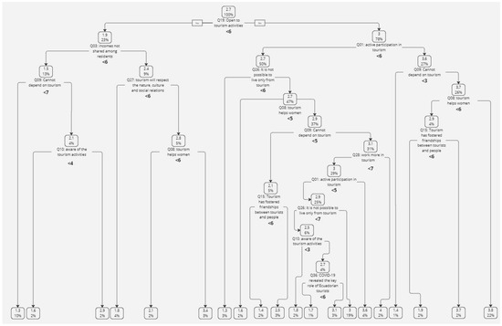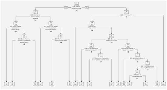 The grouped variables (Q17, Q31) reflect a dual perception of tourism: on the one hand, as the main economic activity; on the other, as a factor that increases the cost of living. This duality suggests a growing awareness of the structural effects of tourism on the local economy and daily well-being. In this regard, Andereck [97] notes that communities may adopt an active role in reflecting on the benefits and costs of tourism, particularly when facing rapid tourism growth. This dimension could indicate a transition from an optimistic view to a more critical stance on the transformations brought about by tourism development.