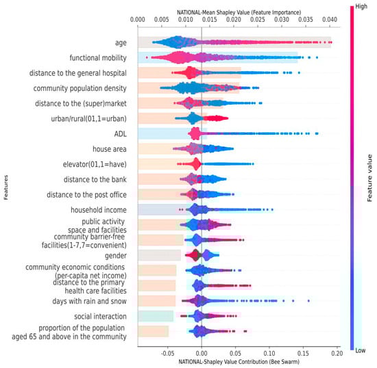 SHAP summary plot for the risk prediction model of insufficient physical activity among older adults in China (National Model, N = 2526). Note: This figure shows feature importance and SHAP values for each selected feature. The bar chart represents global feature importance, while the beeswarm plot provides a local explanation summary. Each dot represents the direction of the effects (positive = red; negative = blue) at different levels for each predictor. When multiple dots overlap in the same position, they accumulate to represent the density.