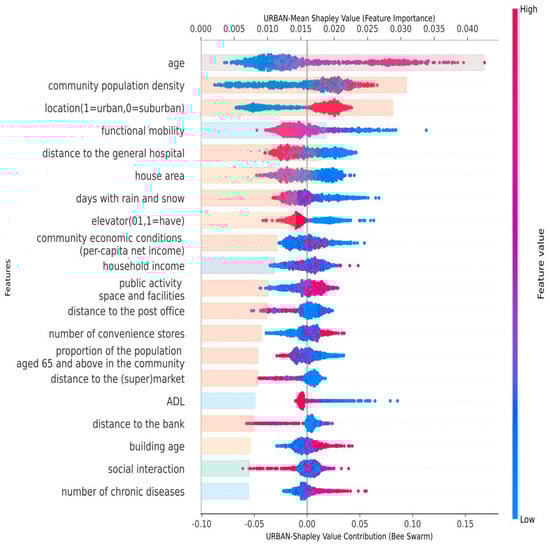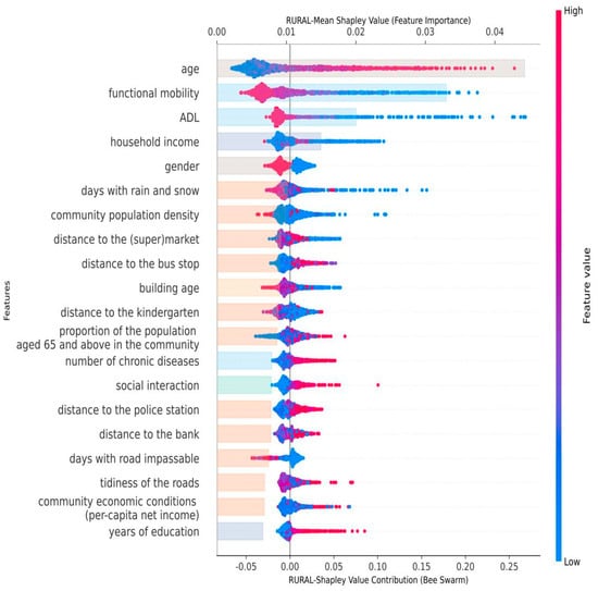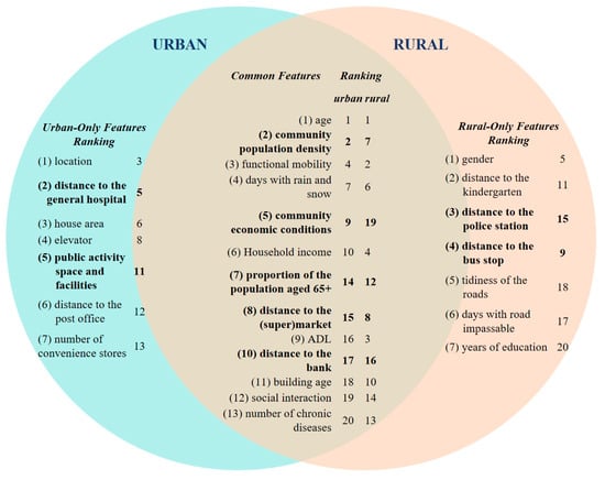 Figure 2 and Figure 3 presented the prediction results for insufficient physical activity among urban and rural older adults, respectively. The results indicated that demographic characteristics, health status, and socioeconomic factors, as well as residential and community built environment factors, served as key predictors of physical activity among older adults in urban and rural areas. However, there were both common and distinct features between these two settings (Figure 4). Specifically, age emerged as the strongest predictor in both models. However, gender exhibited a more pronounced effect in the rural model, with older females demonstrating a higher propensity for physical inactivity compared to their male counterparts. This discrepancy may be attributed to the influence of traditional gender roles, where older men in rural areas are more likely to participate in agricultural or labor-intensive tasks, while women typically focus on lighter household chores, resulting in lower physical activity []. Functional mobility, activities of daily living (ADL), and the number of chronic diseases were common predictors for both urban and rural older adults. Household income and social interaction were also shared factors across both settings, while educational attainment was only relevant for rural older adults. In addition, economic conditions and the proportion of older adults in the community were identified as key predictors of insufficient MVPA in both urban and rural contexts, with economic conditions showing particular significance in urban areas.
