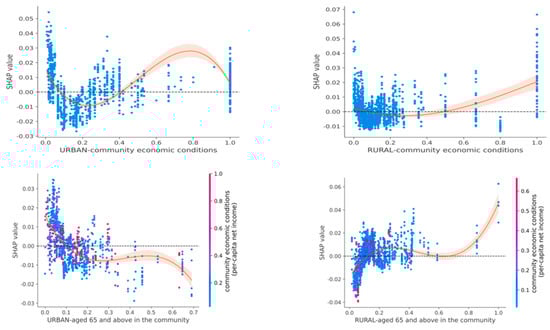 Non-linear associations between key common environmental features and insufficient physical activity risk among older adults in urban and rural areas. Note: The black line in the figures represents the SHAP value threshold of zero. Positive SHAP values indicate a higher risk of insufficient physical activity, while negative SHAP values suggest a protective effect against physical inactivity. Red dots correspond to communities with better economic conditions, and blue dots denote communities with poor economic conditions.