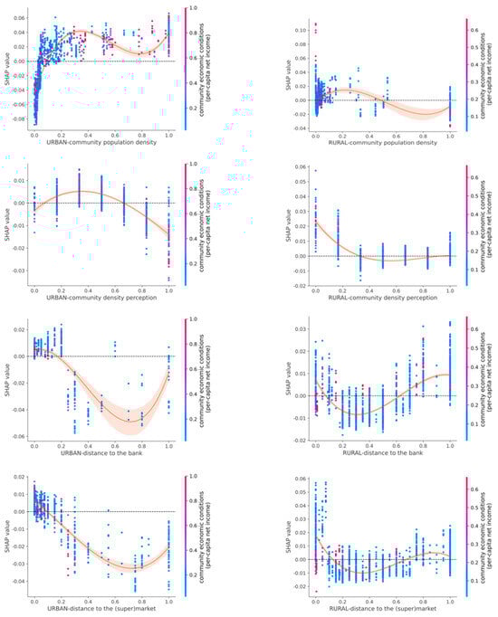 To interpret the contribution of each feature variable, this study employed SHapley Additive exPlanations (SHAP) values to achieve both global and local interpretability. SHAP values quantify the marginal contribution of each input variable to the prediction outcomes, explicitly indicating both the direction (promoting/inhibiting) and magnitude of their influence []. Based on the SHAP feature importance rankings of urban and rural models, this study further uncovered the distinct environmental needs of older adults in these two settings. Furthermore, non-linear association analyses of key environmental features were conducted to offer deeper insights into their complex relationships with insufficient MVPA.