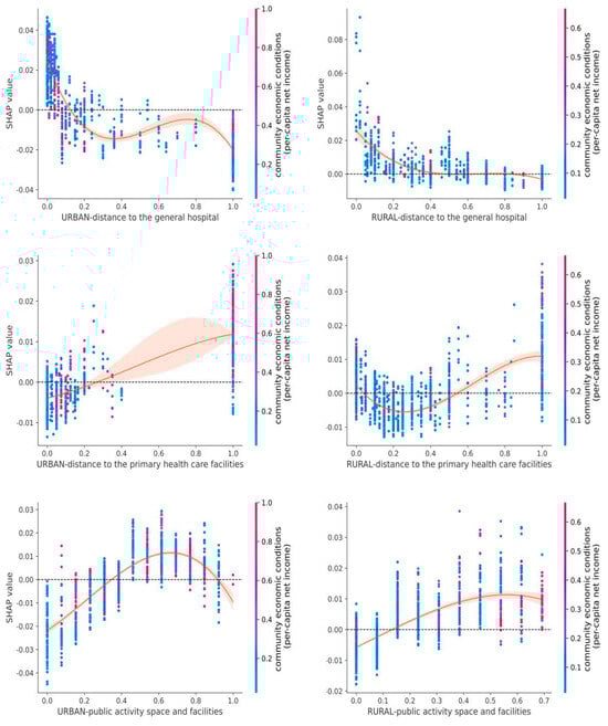 Figure 6 illustrates the non-linear effect of the urban key environmental features. The accessibility to general hospitals ranked high only in urban settings (fifth). A short distance to the general hospital ([0, 0.05], less than 2.5 km) was associated with higher inactivity risk, possibly due to overcrowding and complex traffic conditions. On the contrary, better access to primary healthcare facilities correlated with increased outdoor activities, likely due to improved health literacy and regular health check-ups. This finding aligns with prior research using the number of healthcare facilities as a measure []. Additionally, public activity spaces and facilities also played important roles for urban older adults, exhibiting a U-shaped relationship. Diverse recreational facilities showed significant protective effects against inactivity, but only when the availability reached the upper range ([0.6–1.0], minimum of eight facility types). Notably, our analysis demonstrated that economically disadvantaged communities exhibited a markedly lower diversity in public activity space facilities (as visualized through clustered blue data point distributions). This pattern may reflect systemic spatial inequities in urban resource allocation, where marginalized communities face compounded disadvantages.