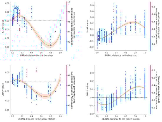 Figure 7 depicts the non-linear associations between key environmental features and insufficient physical activity among older adults in rural settings. Long distances to bus stops and police stations were both significantly associated with physical inactivity, underscoring the critical role of safety perception and transportation infrastructure in rural communities. In rural areas, the distribution of distances to bus stops exhibited relative uniformity across the [0, 1] range, with this variable emerging as the ninth most influential predictor in the rural model. Better public transportation accessibility can effectively mitigate the risk of physical inactivity, particularly for older adults who may no longer drive or lack confidence in driving [,]. However, these two features showed less significance in the urban model. Recent research has indicated that urban residents exhibited sensitivity to bus stop proximity. Wu et al. (2021) observed that physical activity increased with bus stop density up to a threshold of 6 stops/km2, beyond which the effect plateaued []. An excessive proximity to bus stops may discourage physical activity, as shorter distances reduce the need for walking []. Furthermore, perceived safety from crime was also important, particularly in low-density environments where violent crime can be a great barrier to engaging in physical activity [,]. Existing research has examined the positive correlation between perceived safety and physical activity, including walking and overall physical activity [,]. In conclusion, this finding underscores the importance of accessibility to public transportation and police stations in rural areas for maintaining mobility and reducing social isolation among older adults.