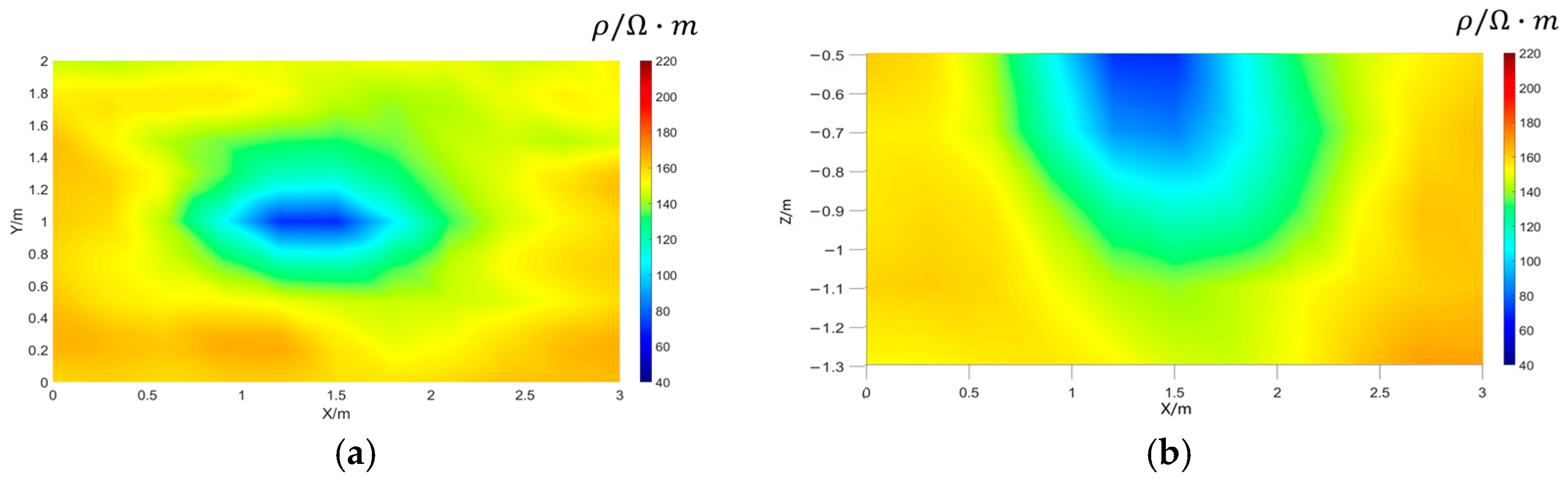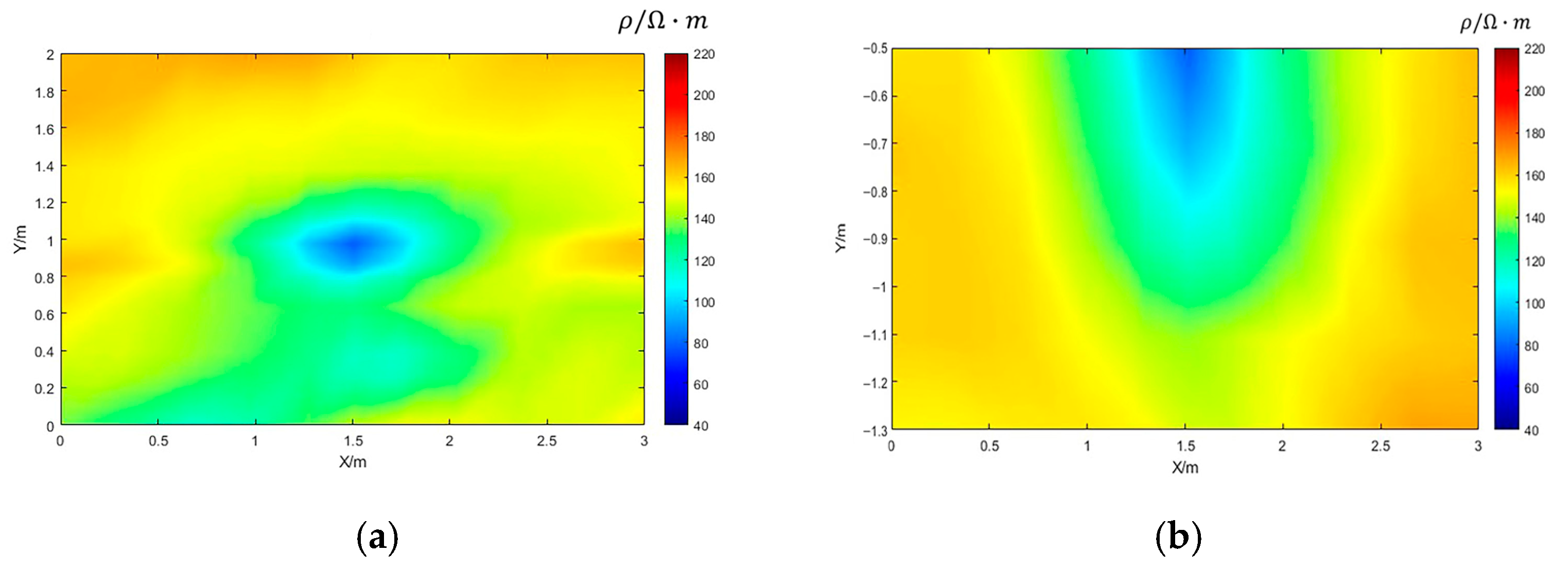 - The maximum deviation between the inferred leakage location and the actual location is 10.1 cm, and the minimum is 6.4 cm, which meets the engineering requirements. The resistivity inversion area can effectively identify both simple point-source leakage points and line-source leakage points;