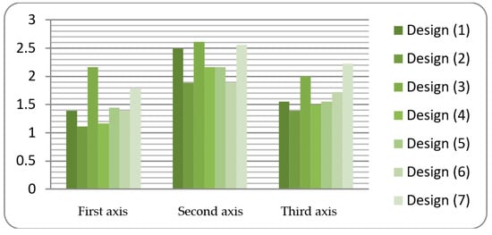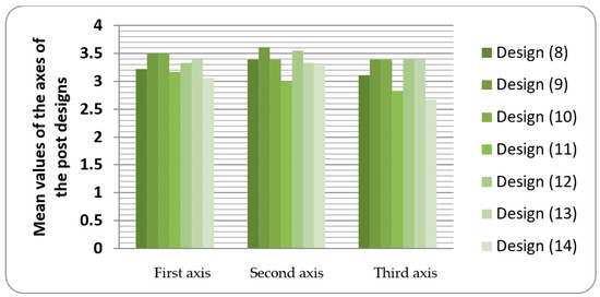 Figure 2. A comparison of the arithmetic mean values of the study axes for the dimensional designs. From the figure, it is clear that the average values of the first and second axes are relatively high for all designs compared to the third axis, indicating the positive impact of employing artificial intelligence applications in designing furniture elements using the art of calligraphy, especially for the ninth, tenth, twelfth, and thirteenth designs, while the arithmetic mean value for the rest of the designs decreased by a somewhat small percentage, indicating that the designs positively express the capabilities of artificial intelligence applications and their impact on designing furniture elements using the art of Arabic calligraphy and the rise in innovative and creative artistic capabilities and formative skills. Moreover, the designs from (8–14) in Table 3 show the post-test using the modern method and employing artificial intelligence technology for wood material in producing interior furniture elements.