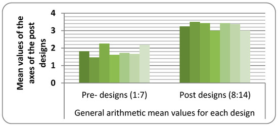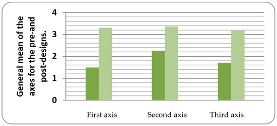 Table 4. Overall arithmetic mean (mean of means) for the axes of the pre- and post-designs.