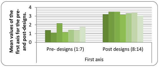 Comparison of the arithmetic mean values of the first axis for the pre- and post-designs.
