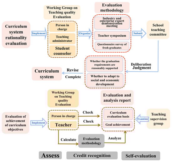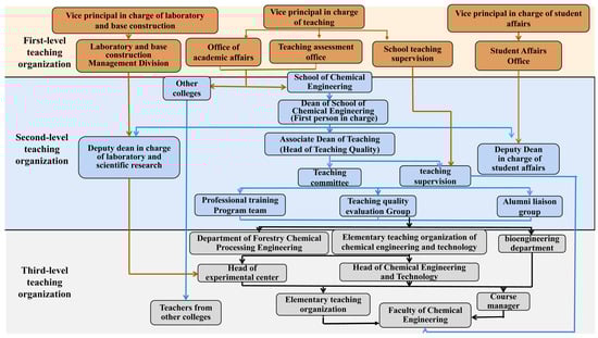 This research aims to achieve engineering education objectives and establish a talent cultivation model guided by these twelve standards, fostering students’ fundamental engineering abilities, teamwork and communication skills, personal abilities, and professional ethics, as well as the capabilities of Plan-Do-Check-Act in enterprise or engineering environments [28]. The OBE–PDCA model combines Outcome-Based Education (defining competencies upfront) with Plan-Do-Check-Act cycles (iterative quality improvement). This synergy ensures continuous alignment between course outcomes and evolving industry needs. To ensure the effective implementation of the continuous improvement mechanism for professional courses, this research utilizes the OBE–PDCA comprehensive quality management concept to establish a dynamic monitoring system of monitoring control-evaluation feedback-continuous improvement [29]. Concurrently, the continuous improvement working group will deploy and implement improvement measures based on the feedback received, track the outcomes of these improvements, and create a closed-loop feedback mechanism. As illustrated in Figure 1, the organizational structure of teaching management is presented, clarifying the responsibilities and interrelationships of various organizational levels. This structure ensures comprehensive monitoring and continuous improvement of teaching quality.