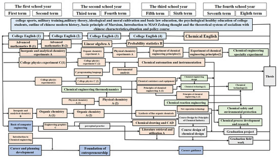 Topological relationship diagram of curriculum system for the major of Chemical Engineering and Technology. Remarks: blue—compulsory courses for general education; red—basic courses of professional disciplines; green—professional core and specialty courses; yellow—intensive practice class.