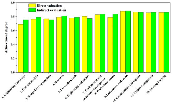 The comparison between direct and indirect evaluations is clearly illustrated in Figure 5, providing a basis for a more comprehensive understanding of graduates’ learning achievements. Among these, the evaluation scores of personal and teamwork and communication and expression were relatively high, indicating that graduates received strong training in these areas. However, the evaluation scores of engineering and society and engineering knowledge were comparatively low, suggesting an urgent need to enhance capabilities in these two graduation requirements. Moreover, these results demonstrate that the student training model oriented towards engineering education certification is effective, supporting the sustainable development of the program.