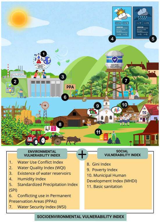 Vulnerability can be expressed through indices. Research conducted in Brazil and around the world has already used indices as an efficient quantitative and classification tool for risk levels [32,51,59,60,61,62,63,64,65]. However, socioenvironmental vulnerability indices are mostly applied in urban areas and are related to the risks of environmental events, such as floods, earthquakes and inundations. The Socioenvironmental Vulnerability Index (SEVI) [66] stands out among such indices, which considers indicators such as the Standardized Precipitation Index (SPI), Water Use Conflict in Water Resource Management Index (WCMI), Water Use Conflict in Water Resource Planning Index (WCPI), Water Security Index (WSI), Humidity Index (HI) and Social Vulnerability Index (SVI) to analyze socioenvironmental vulnerability related to drought in rural settlements.